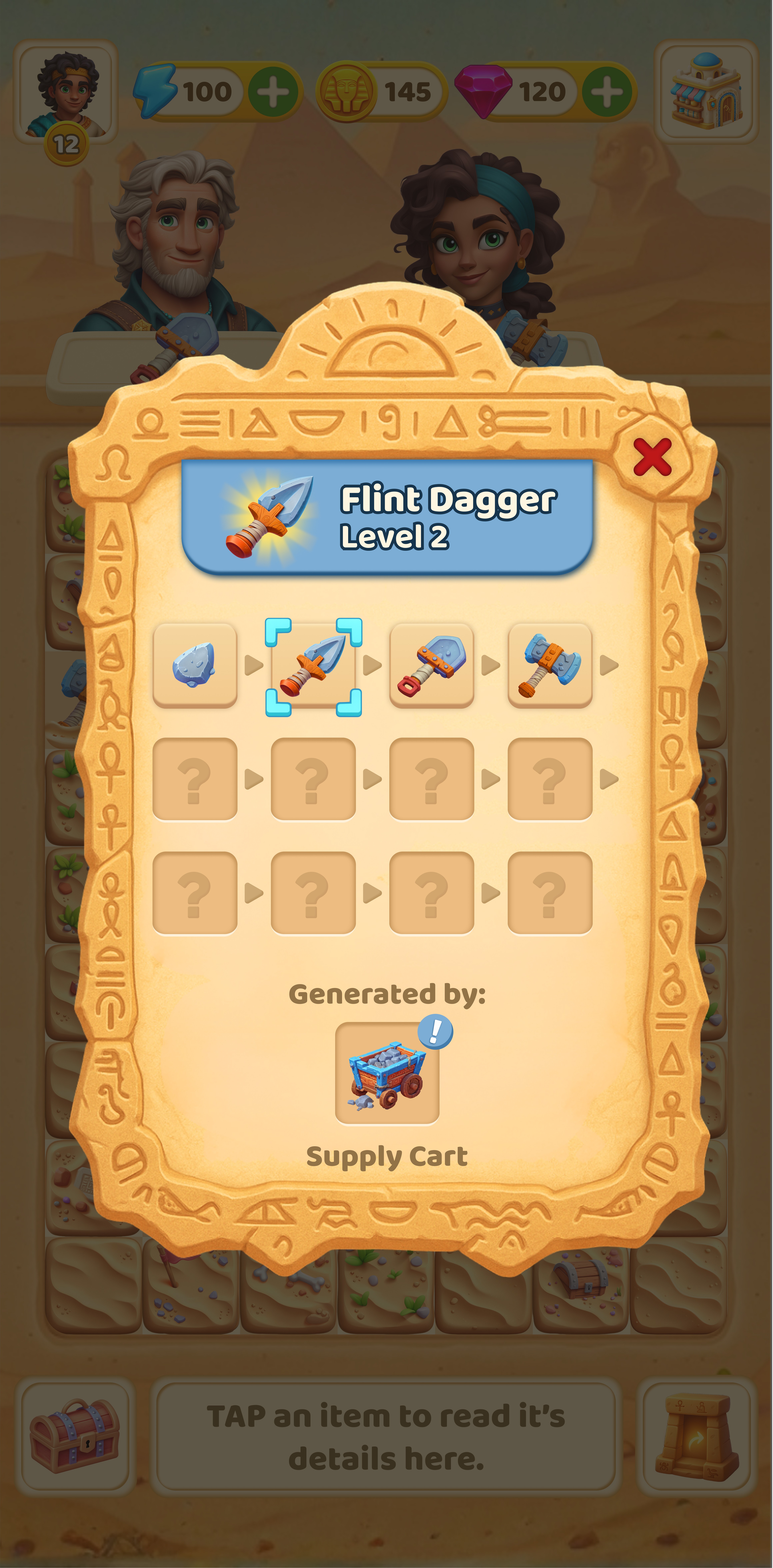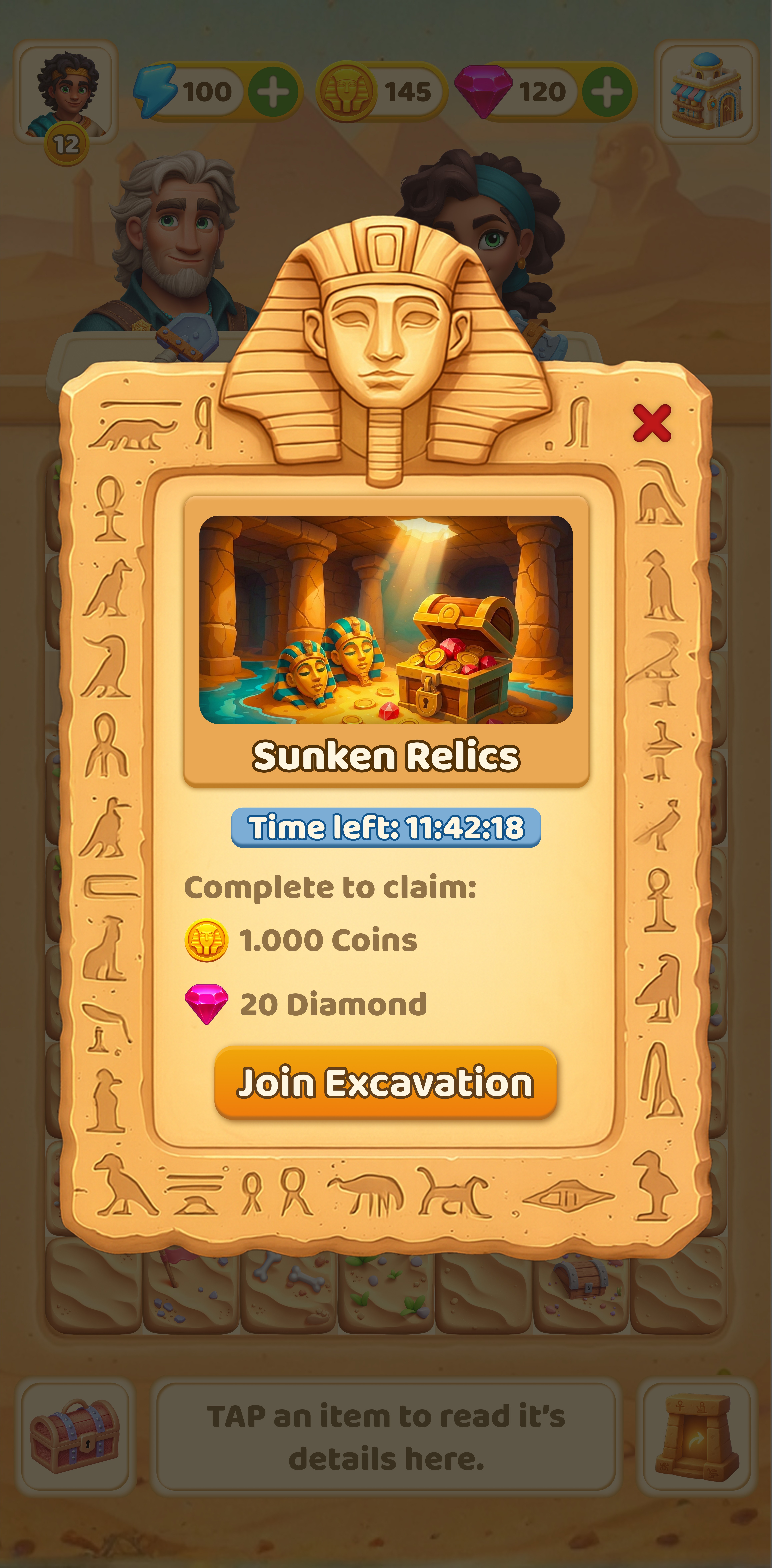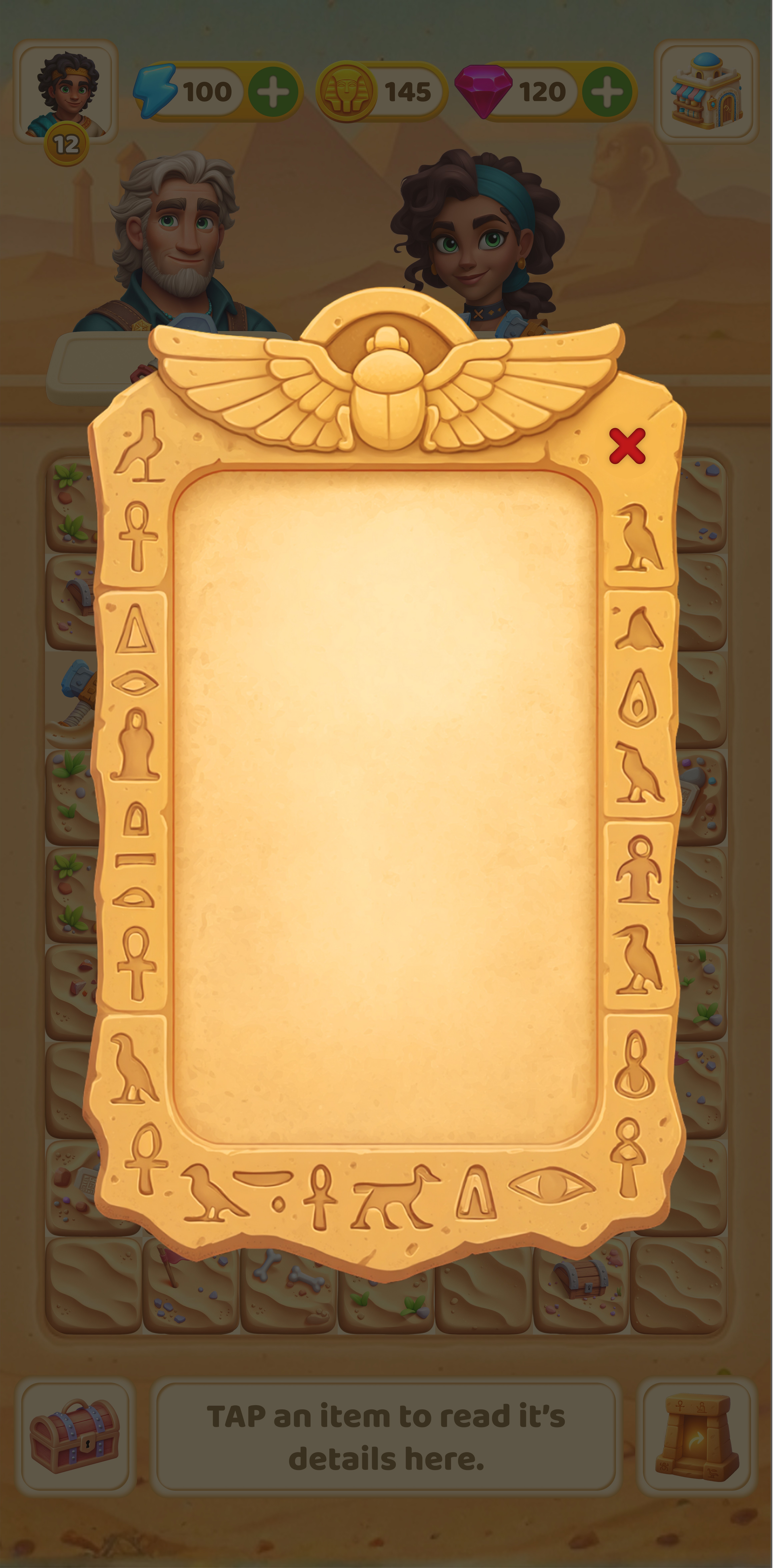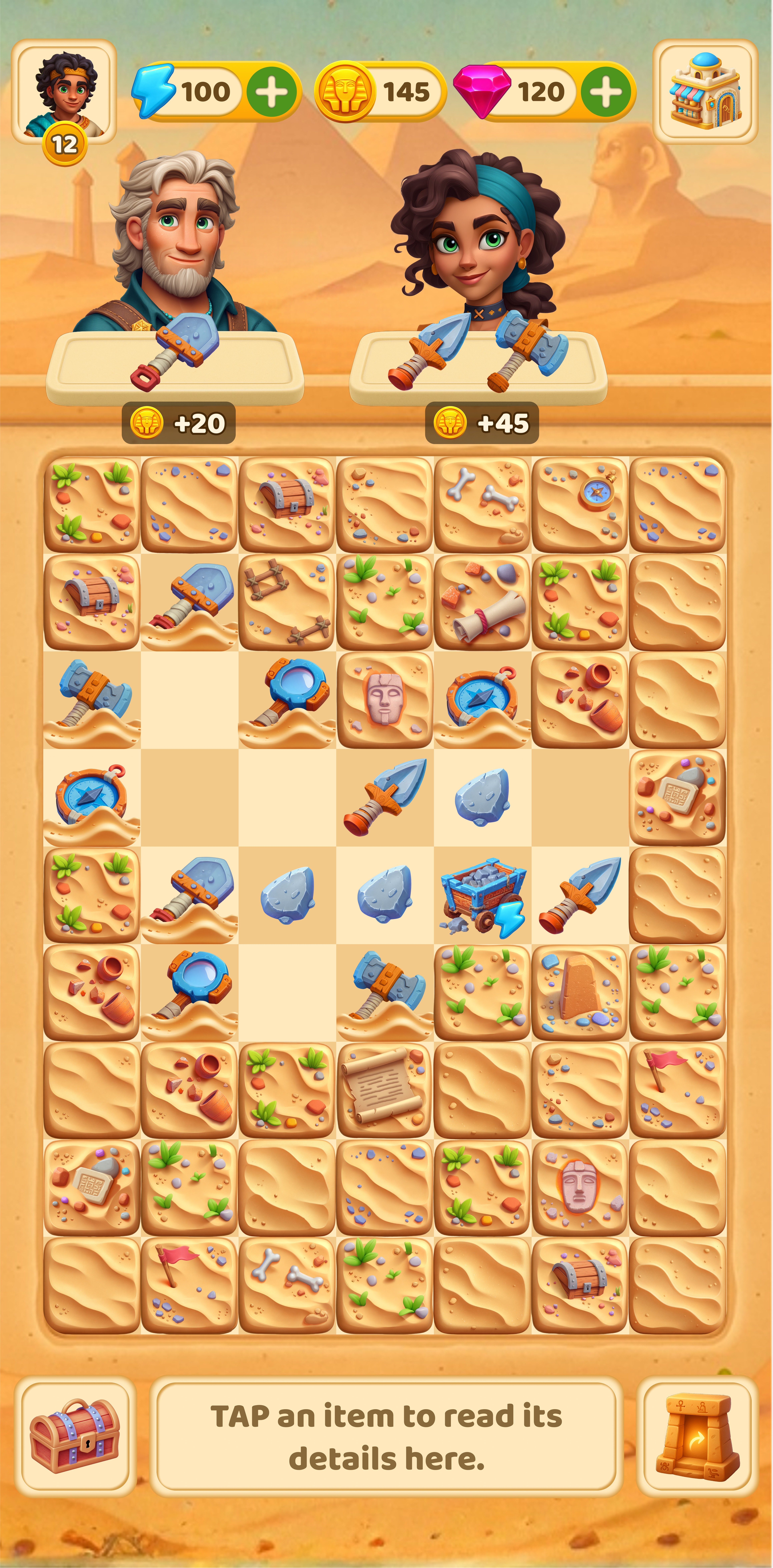 In this project, I designed a game where players uncover ancient Egyptian artifacts through excavation. Each discovery creates a clear sense of progression as new elements are revealed. I developed the tool progression, Egypt themed UI style, and visual language to support exploration, aiming to create an engaging archaeological adventure that keeps players motivated.